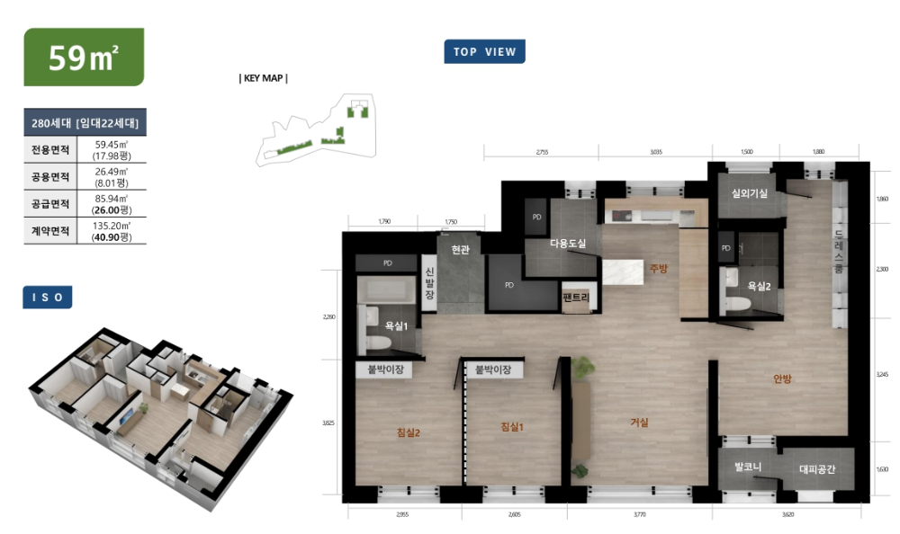 | 59㎡ | 방3 / 욕실1 | 드레스룸, 발코니, 안전대피공간 |