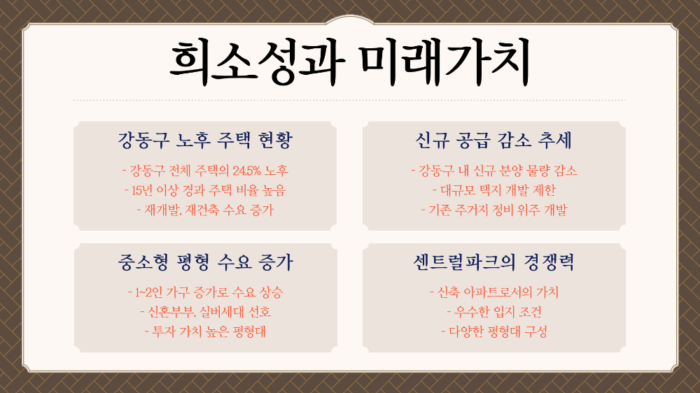 서울 강동구는 최근 재개발과 도시정비사업이 활발하게 진행되고 있지만, 여전히 전체 주택의 약 24.5%가 15년 이상 된 노후 주택이에요. 이런 상황 속에서 신축 아파트에 대한 수요는 자연스럽게 높아질 수밖에 없어요. 바로 이 점이 성내동 센트럴파크의 ‘희소성 프리미엄’을 강화해주는 배경이에요.