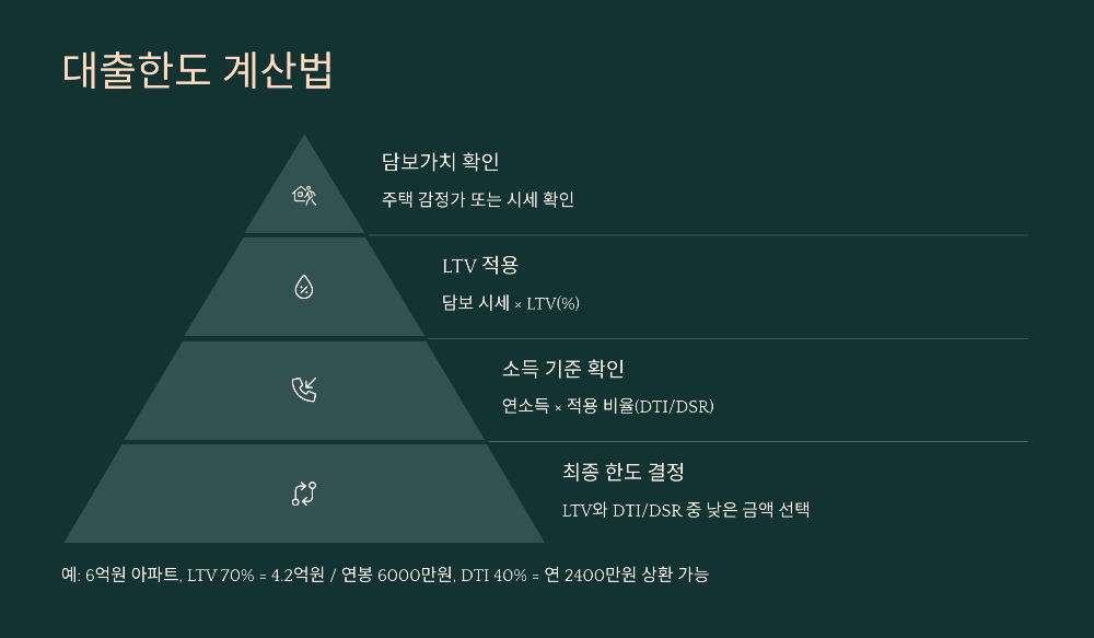 | 한도 기준 | LTV, DTI, DSR 등 적용 |