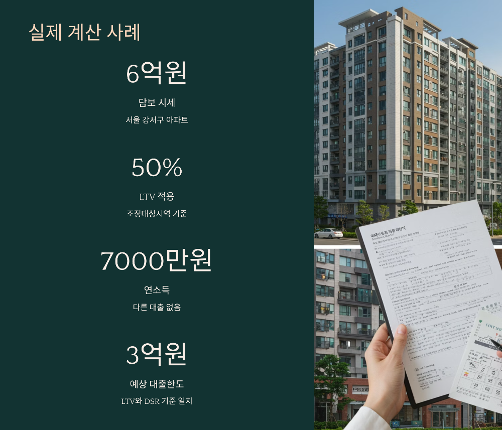 그럼 실제 사례를 통해 대출한도 계산을 한번 살펴볼게요. 김영수 씨는 서울 강서구에 있는 6억 원짜리 아파트를 담보로 대출을 받으려 해요. 연봉은 7000만 원이고, 다른 대출은 없어요.