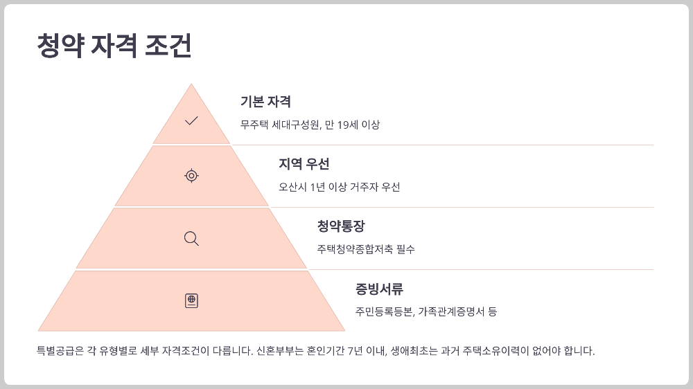 특별공급의 경우 각 유형별로 세부 자격조건이 달라요. 신혼부부는 혼인기간 7년 이내, 생애최초는 과거 주택소유이력이 없어야 하고, 소득 및 자산 기준도 충족해야 해요.