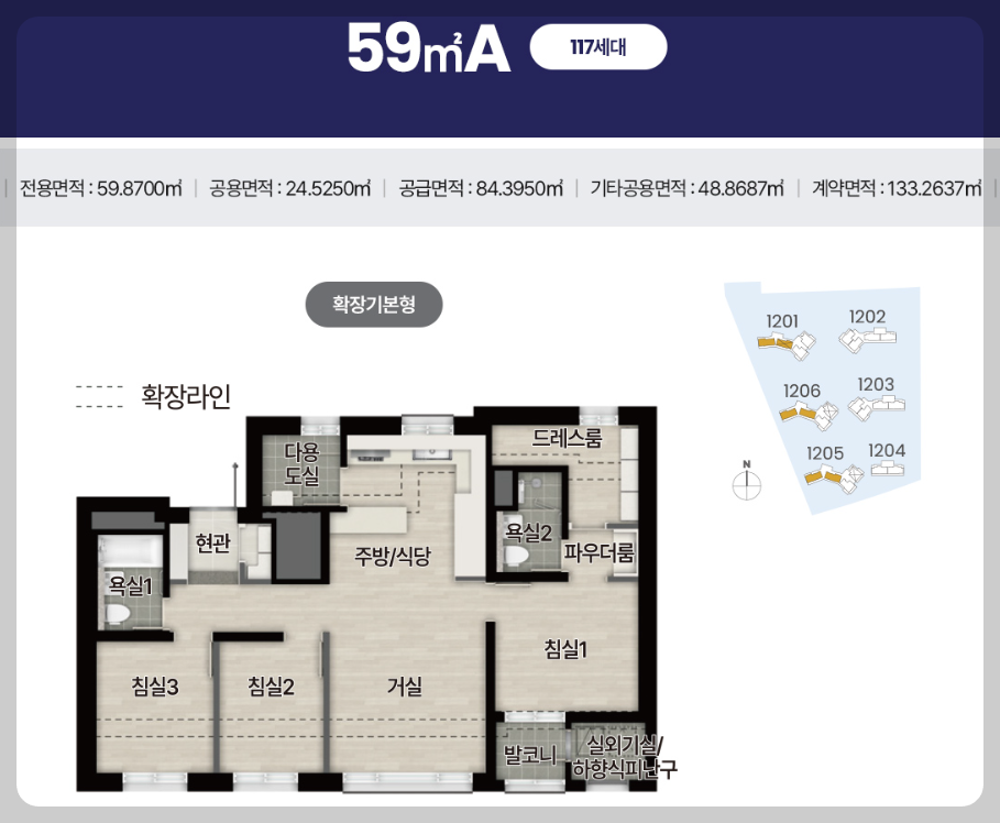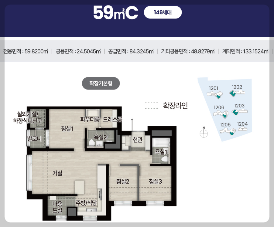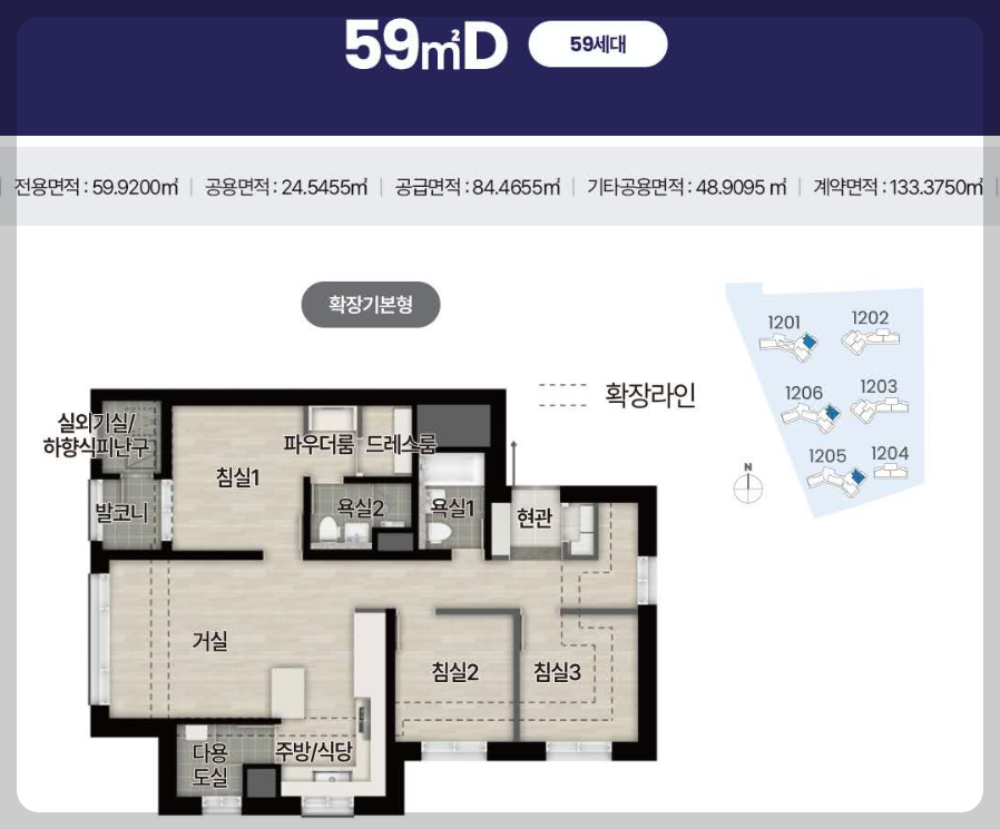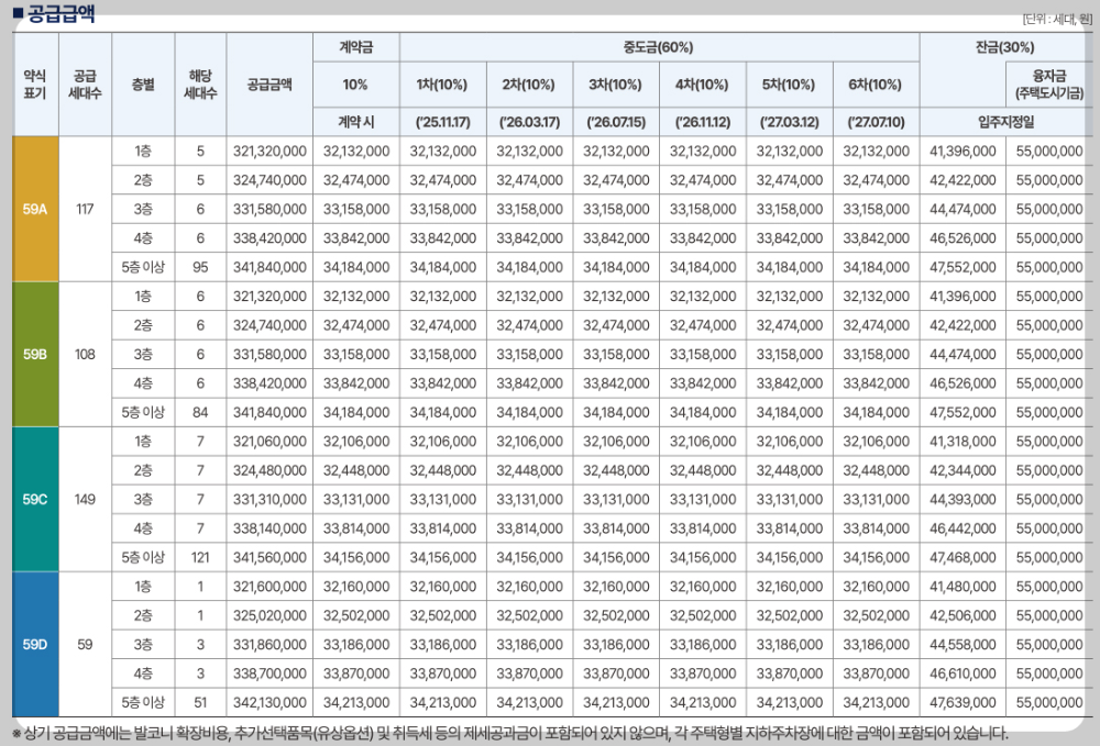 세대 타입은 A~D타입까지 4가지로 나뉘며, 가장 많은 물량은 59㎡C타입으로 149세대가 공급돼요. 다음으로 59㎡A타입이 117세대, B타입 108세대, D타입은 59세대예요.