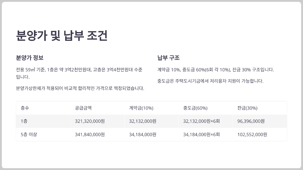 공급가는 전용면적, 층수에 따라 차등 적용되며 분양가 상한제 대상 주택으로 비교적 합리적인 가격이 책정됐어요.