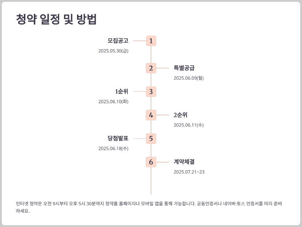 청약 일정은 특별공급과 일반공급 1, 2순위로 구분돼요. 특별공급은 6월 9일, 일반공급 1순위는 6월 10일, 2순위는 6월 11일에 접수해요.