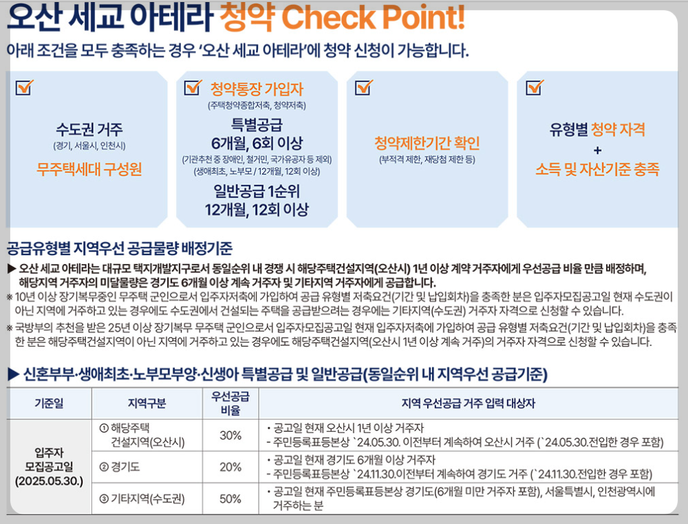 우선, 수도권 거주자로서 입주자 모집공고일(2025.05.30) 기준, 만 19세 이상 성인이어야 해요. 특히 오산시에 1년 이상 거주한 경우 지역 우선공급 대상자로 신청할 수 있어요.