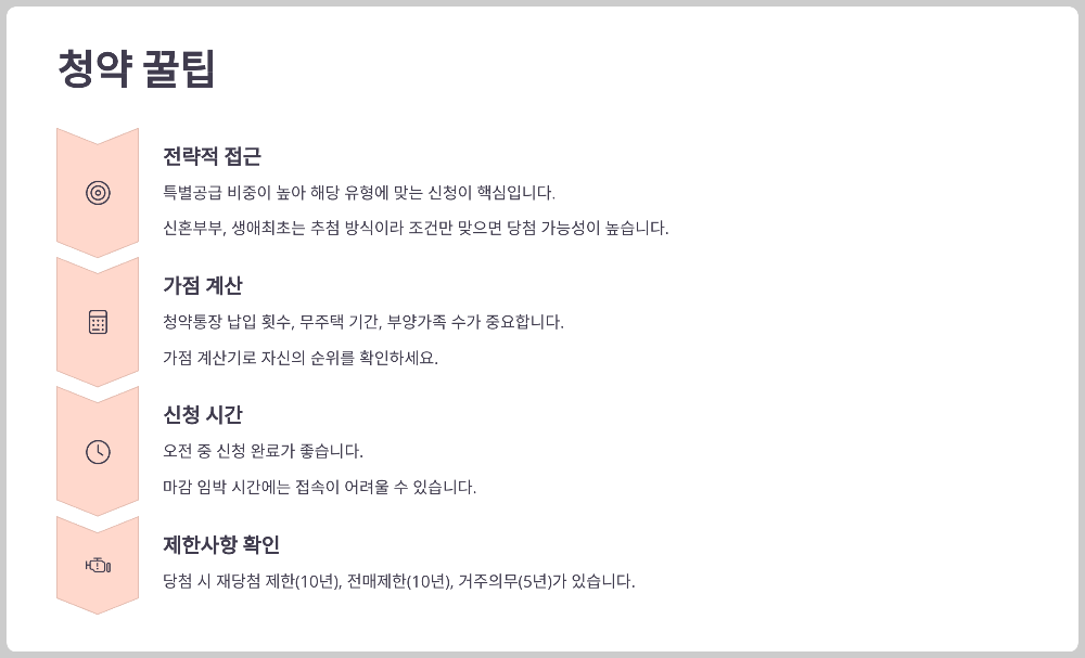 청약은 단순한 추첨이 아니라 ‘전략 게임’이에요! 내가 생각했을 때, 오산 세교 아테라는 특별공급 비중이 높기 때문에 해당 유형에 맞는 신청이 핵심이에요 🎯