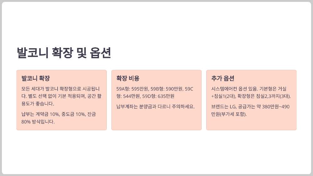 발코니 확장은 선택이 아닌 전 세대 의무 확장형으로 시공돼요. 확장 비용은 타입별로 다르며, 59㎡ 기준 540만~635만 원 사이로 책정됐어요.