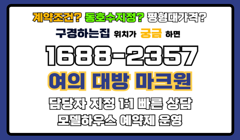 지금부터 여의대방 더마크원의 입지, 구조, 교육, 옵션, 투자 관점까지 한눈에 정리해 드릴게요! 보다 빠르고 자세한 문의는 주택 홍보관 상담 번호로 연락을 주시면 되세요