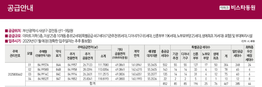 더파크 비스타동원은 부산 사상구 감전동에 위치한 대규모 민영 아파트 단지예요. 2025년 10월 10일 모집공고가 발표되었고, 입주는 2028년 12월 예정이에요.