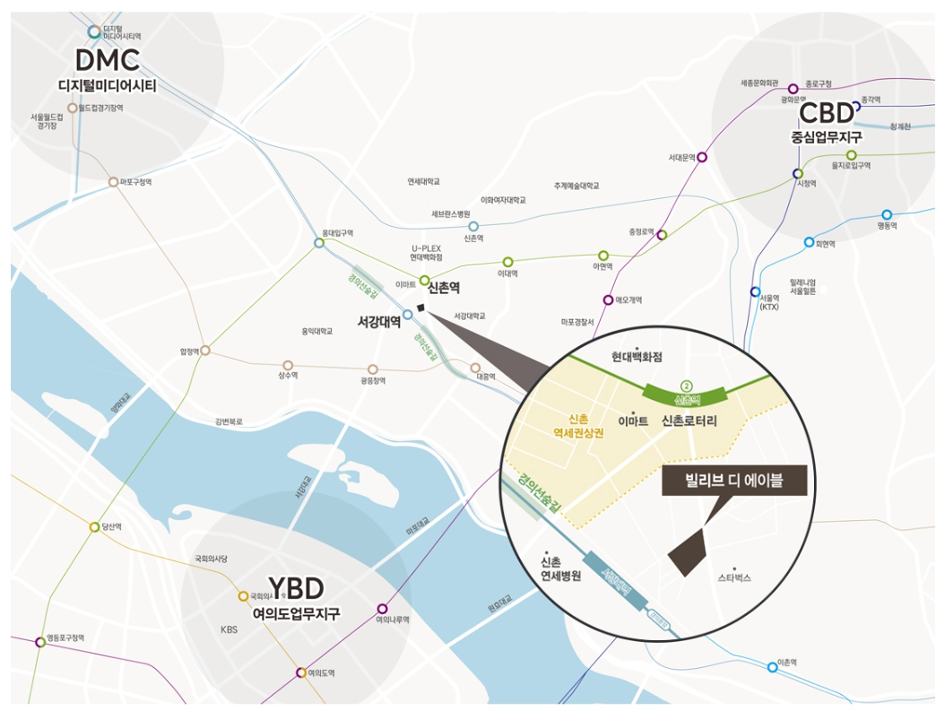 마포와 여의도 시청을 잇는 서울 중심지로 신촌역과 서강대역을 이용하는 더블 역세권.