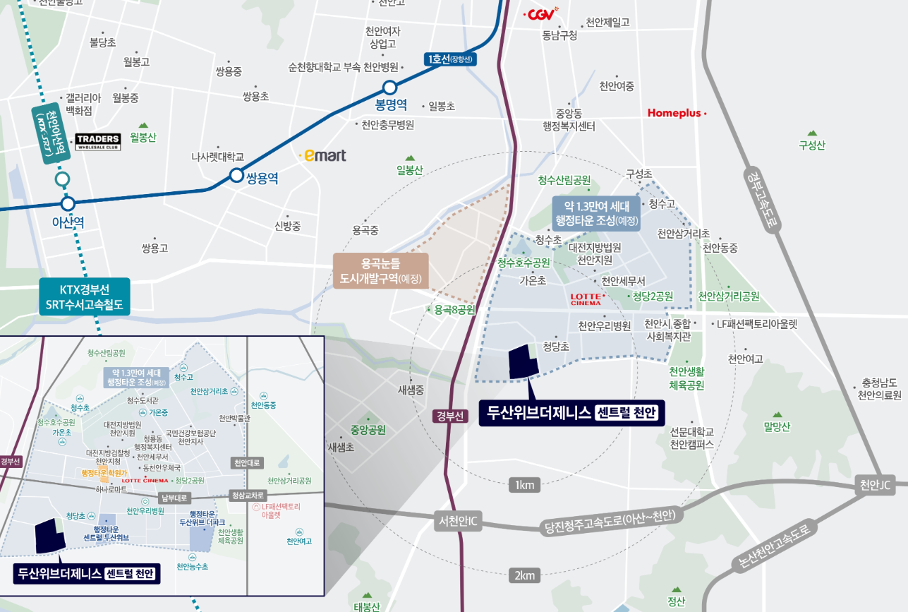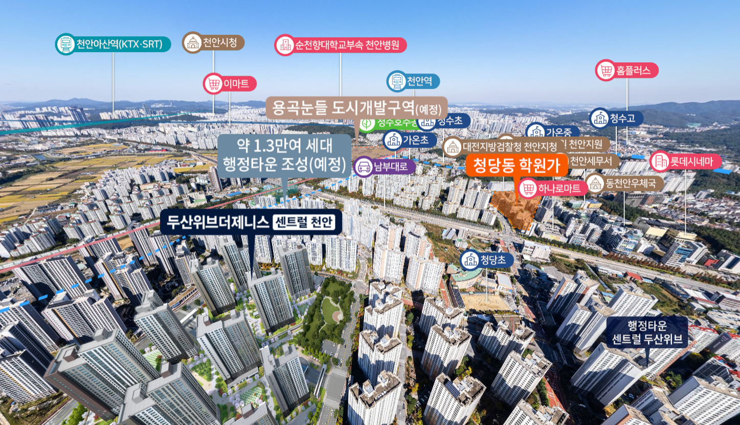두산위브더제니스 센트럴 천안이 들어서는 청당동은 천안에서 최근 가장 주목받는 행정복합타운이 밀집한 권역이에요. 청수지구와 함께 시청, 법원, 세무서 등 주요 기관들이 집중되어 있어 직주근접 수요가 풍부하죠.