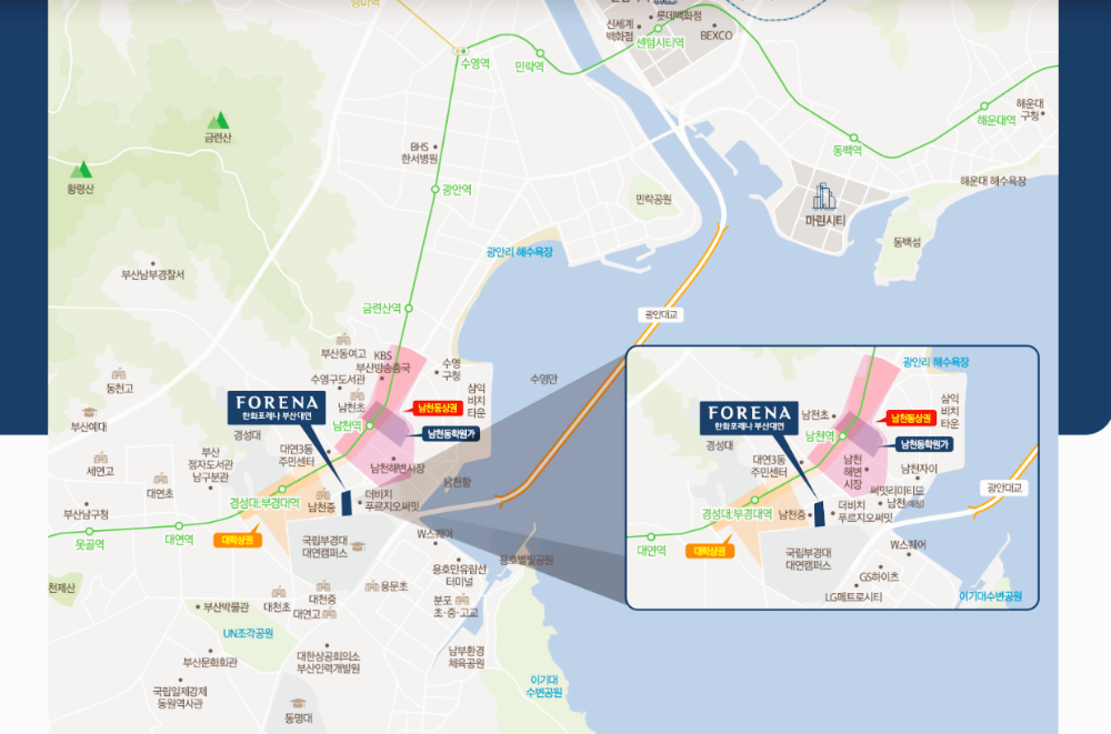 - 인프라: 경성대 상권의 힙한 분위기와 남천 해변시장의 실생활 인프라를 동시에 누릴 수 있는 더블 생활권입니다.