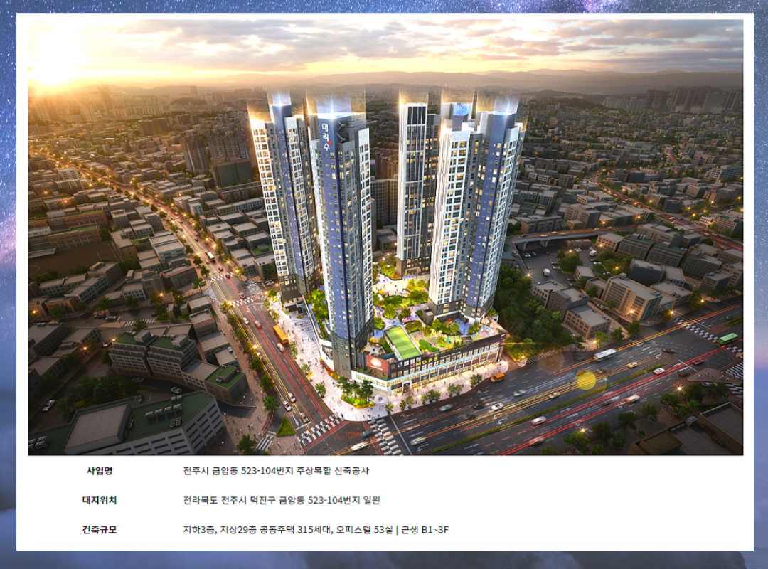 전주 대라수 글로벌에듀 민간임대 아파트는 전북 전주시 적진구 금암동 523-104번지 일원에 위치하고 있습니다. 지하 3층부터 지상 29층 공동주택 315세대, 오피스텔 53실, 근린생활시설 총 49개 호실로 이루어져 있습니다. 금암동에 위치한 최고 29층 주상복합으로 아파트 전용면적 84 타입 315세대, 오피스텔 전용면적 84 타입 53실 , 상가 23호실 동시 공급이 진행됩니다.