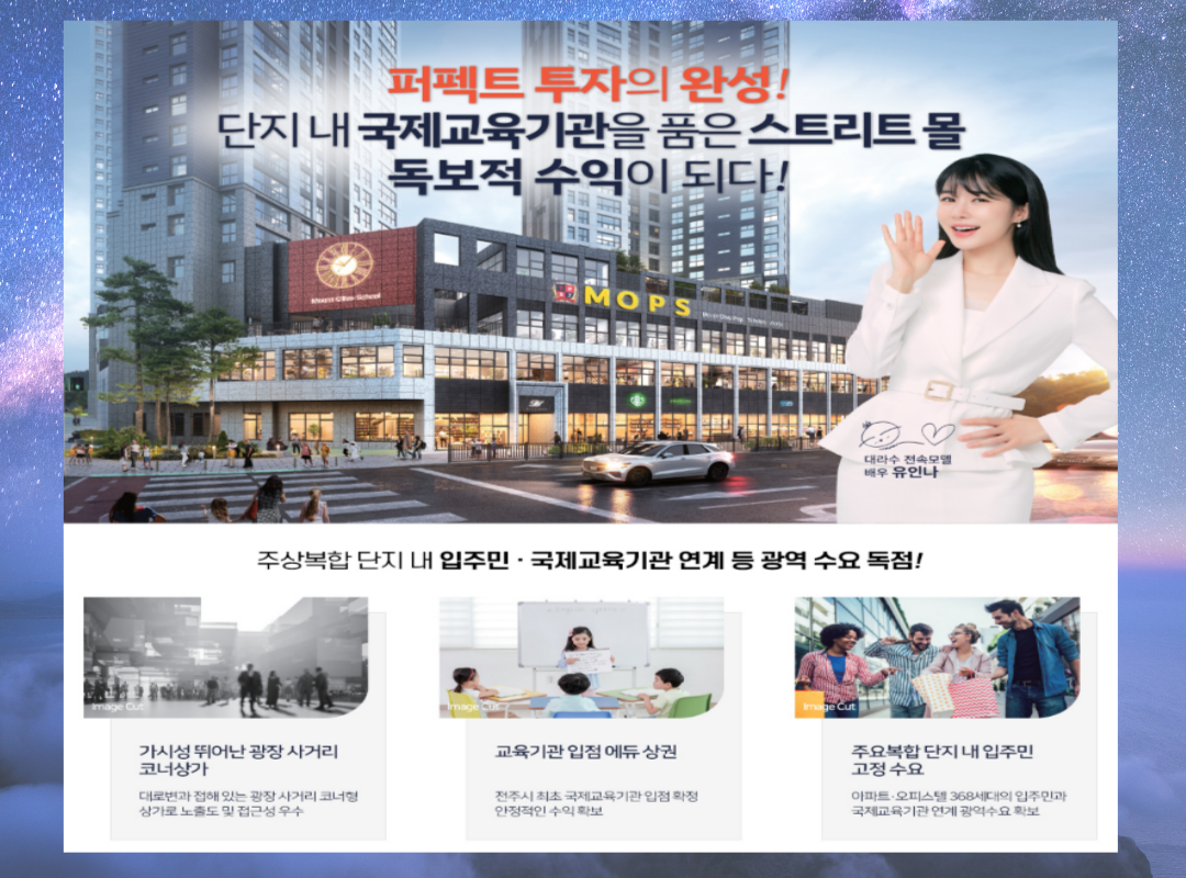 또한 전주 대라수 글로벌에듀는 주상복으로 구성되어 있어 오피스텔과 상가가 함께 있습니다. 이는 직주근접과 투자가치를 높여주는 요소입니다. 상가는 단지 내 입주민들의 생활 편의를 위한 근린생활 시설로 운영될 예정이며 , 오피스텔은 자영업자나 프리랜서 등 에게 적합한 공간이 될 것입니다.