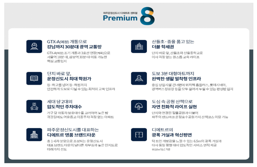 파주운정신도시 디에트르 센트럴은 GTX-A 운정역과 가깝고 초등학교, 중학교, 고등학교가 도보 5분 거리에 있어 자녀 교육에 좋은 입지를 자랑하며 홈플러스, 롯데시네마, 운정호수공원등 다양한 편의시설과 문화시설이 인근에 있어 생활이 편리합니다. 그리고 파주메디컬클러스터, 스타필드 빌리지, 운정테크노밸리, GTX-A 운정역 등 다양한 대형호재 갖추고 있어 추후 교통, 문화, 의료와 같이 생활 인프라는 더욱 높아질 것으로 기대 됩니다.