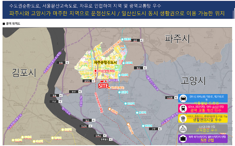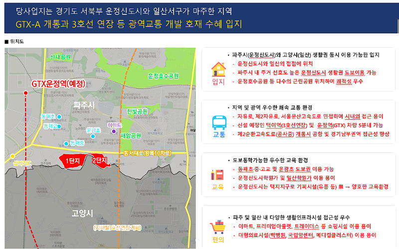 교통은 GTX-A노선과 경의중앙선, 제2자유로, 수도권 제2외곽순혼도로 등 교통 인프라가 잘 갖춰져 있어 서울과 강남권으로의 접근성이 뛰어납니다. GTX-A노선은 운정역에서 강남역까지 약30분만에 도착할수 있습니다.