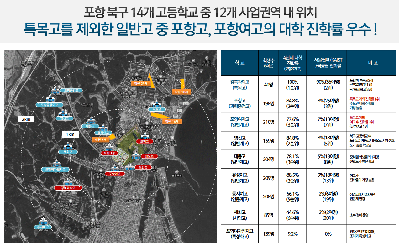 - 여기에 포항을 대표하는 포항고등학교, 포항여중고와 초등학교, 학원시설이 자리하는 등 우수한 교육환경과 학산공원, 학산천, 우현도시숲 등이 근접에 위치하고 있어 탁월한 면락분위기 조성되어 있음