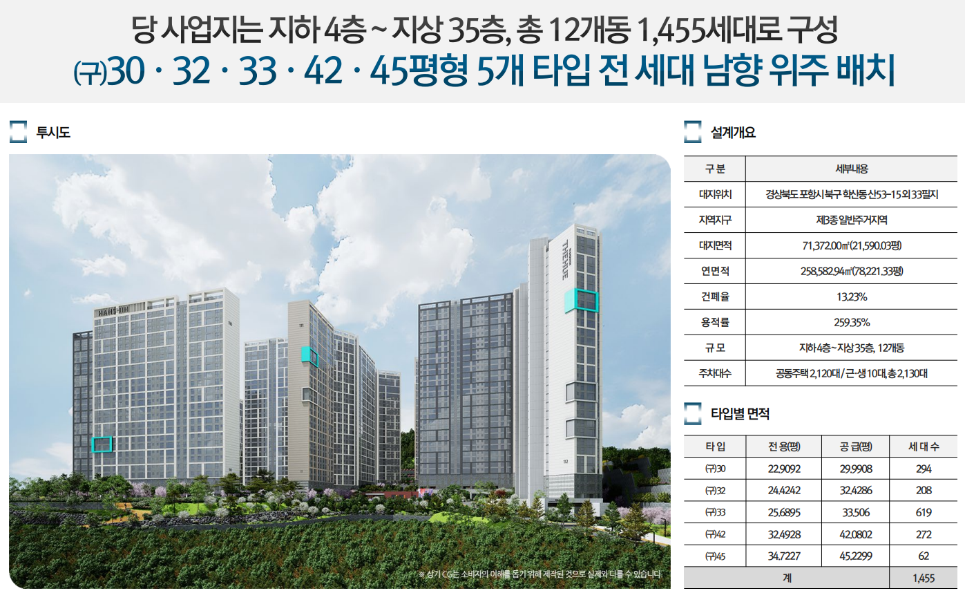 - 규모 : 지하 4층 ~ 지상 35층 공동주택 12개동 , 전용 75㎡~114㎡ 총 1.455세대