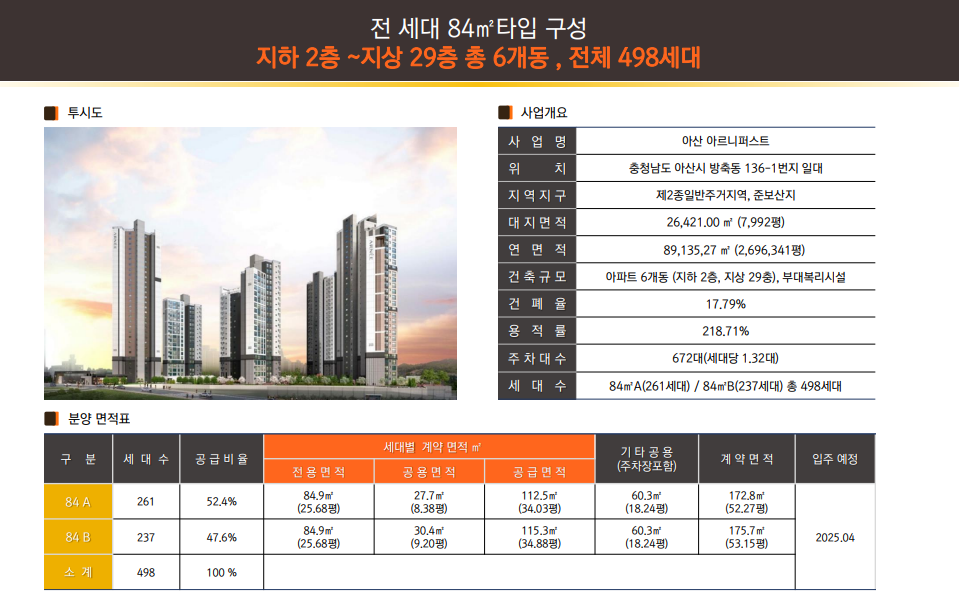 - 이 단지는 전용 84㎡ A타입 261세대, B타입 237세댈 이루어져 있으며, 단일 평수로 공급합니다.알파룸, 펜트리, 디긋자 주방, 드레수룸 등 공간을 효율적으로 활용할 수 있도록 구성되었으며 최고 29층의 높이로 호수공원을 바라볼 수 있는 아산의 랜드마크 단지가 될것입니다.