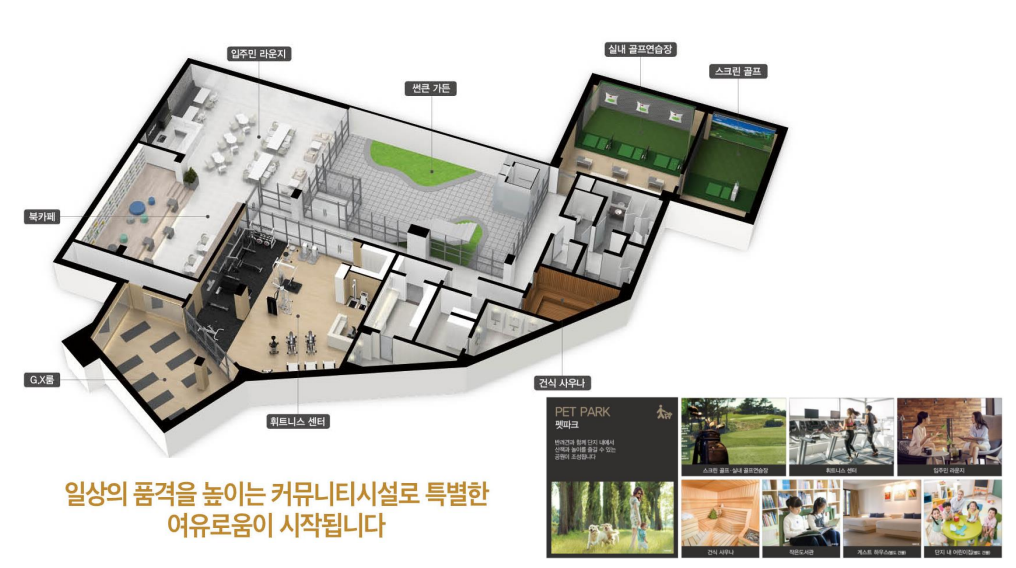 - 또한 이 단지는 입주민들의 편의시설이 준비가 되어있습니다. 북카페,GX룸, 휘트니스센터, 건식 사우나, 골프연습장, 가든, 라운지 등 다양한 커뮤니티 시설과 어리이집, 게스트하우스, 작은도서관 등 편의시설이 마련됩니다.