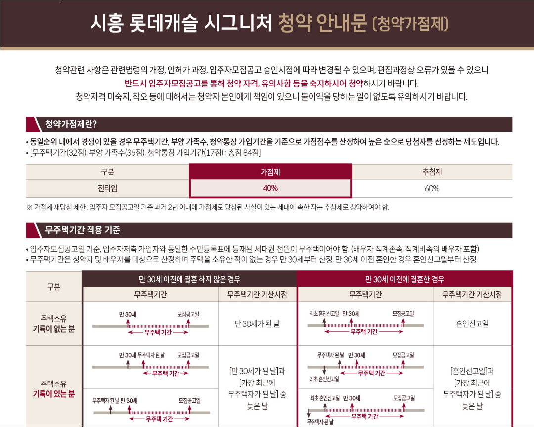 - 전용면적 85㎡ 이하 : 가점제(40%) 및 추첨제(60%) 적용