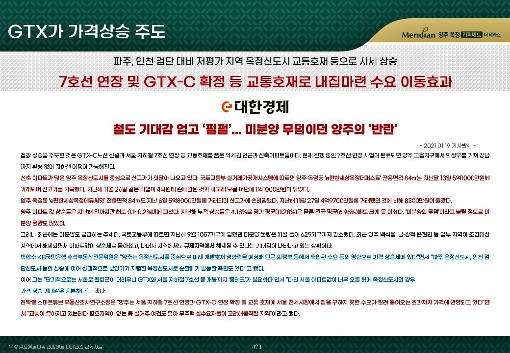 현재 양주옥정 월드메르디앙 라피네트 더테라스는 회사보유분을 3년전 분양 당시 분양가로 일부세대를 공급하고 있습니다. 인근 타 주변 단독주택 및 타운하우스 시세보다 저렴한 가격대입니다. 양주 옥정동에서 대지지분 약 60평과 실사용 평수 약 80평 정도가 나오는 주택에 거주할 수 있는 기회입니다.