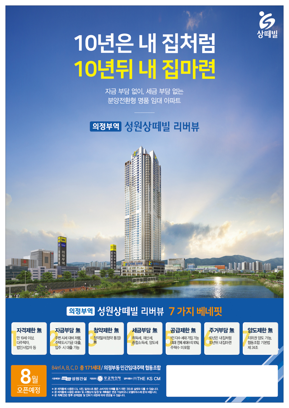 의정부역 성원상떼빌 리버뷰는 지하 5층 ~ 지상 47층으로 총 171세대가 공급되며, 주차 공간은 공동주택 215대, 근린생활시설 50대 총 265대입니다. 타입 구성은 84㎡ 단일평형으로 선호도가 높은 국민주택 규모입니다. 각 타입별로 특징은 다음과 같습니다.