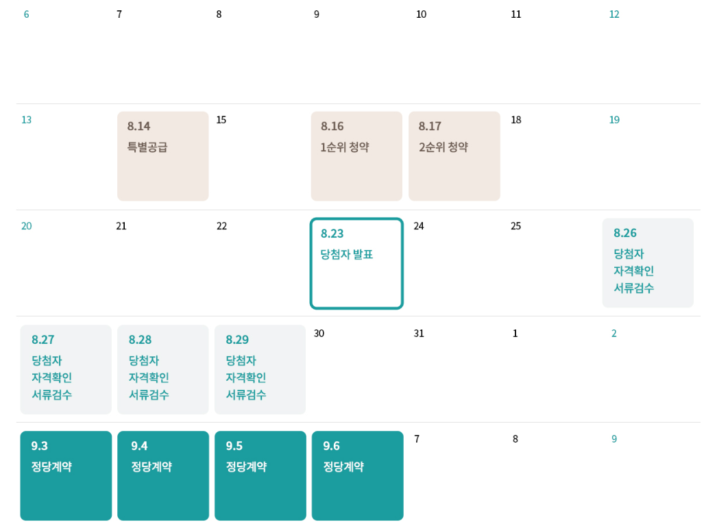 - 일반공급: 8월16 (수) / 한국부동산원 청약홈 사이트를 통해 접수 / 일반공급 물량에는 유주택자도 청약 가능하며, 세대주는 물론 세대원도 청약할 수 있음